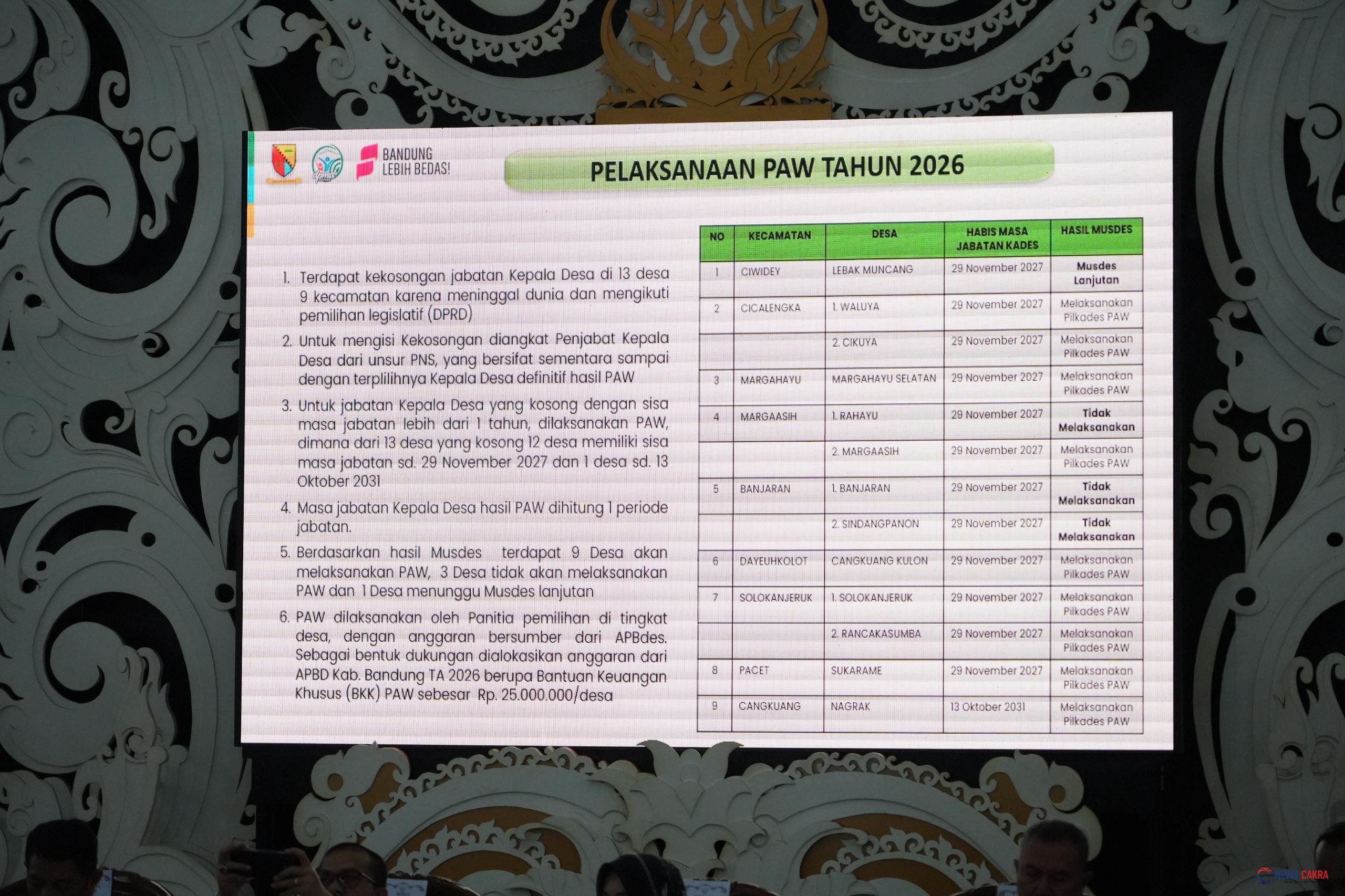 Newscakra – Bupati Bandung, Dadang Supriatna memimpin Rapat Koordinasi Pemilihan Kepala Desa Pergantian Antar Waktu (Pilkades PAW), Senin (30/3/2026) di Rumah Dinas Bupati, Soreang. Rapat tersebut dihadiri para kepala OPD, Kapolresta Bandung, dan jajaran Forkopimda.