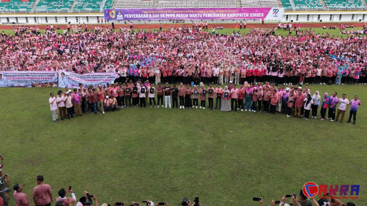 JEMBER , Newscakra.comPemerintah Kabupaten Jember menyerahkan 8.344 SK PPPK Paruh Waktu, meneguhkan komitmen pengabdian untuk Jember Baru dan Jember Maju. Penyerahan ini dilakukan di Jember Sport Garden (JSG) pada Selasa, 23 Desember 2025, kepada tenaga non-ASN sebagai wujud kepastian status bagi para pengabdi daerah.