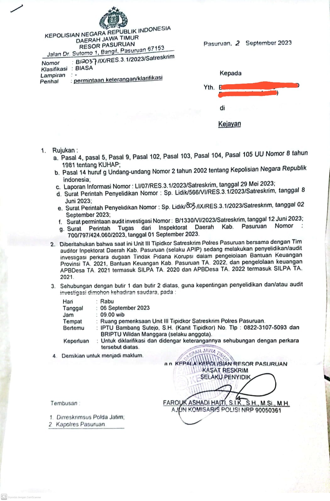Berdasarkan Laporan Informasi dan Surat Perintah Penyelidikan Sp. Lidik/566/VI/RES.3.1/2023 tanggal 8 Juni 2023 dan Sp. Lidik/803/IX/RES.3.1/2023 tanggal 2 September 2023, Polres Pasuruan menyelidiki proyek fisik, bor air bersih, PJU, bantuan ketahanan pangan ternak kambing dan lele, serta anggaran SILVA yang bersumber dari Dana Desa dan Provinsi. Audit Inspektorat mengungkap potensi kerugian mencapai miliaran rupiah.