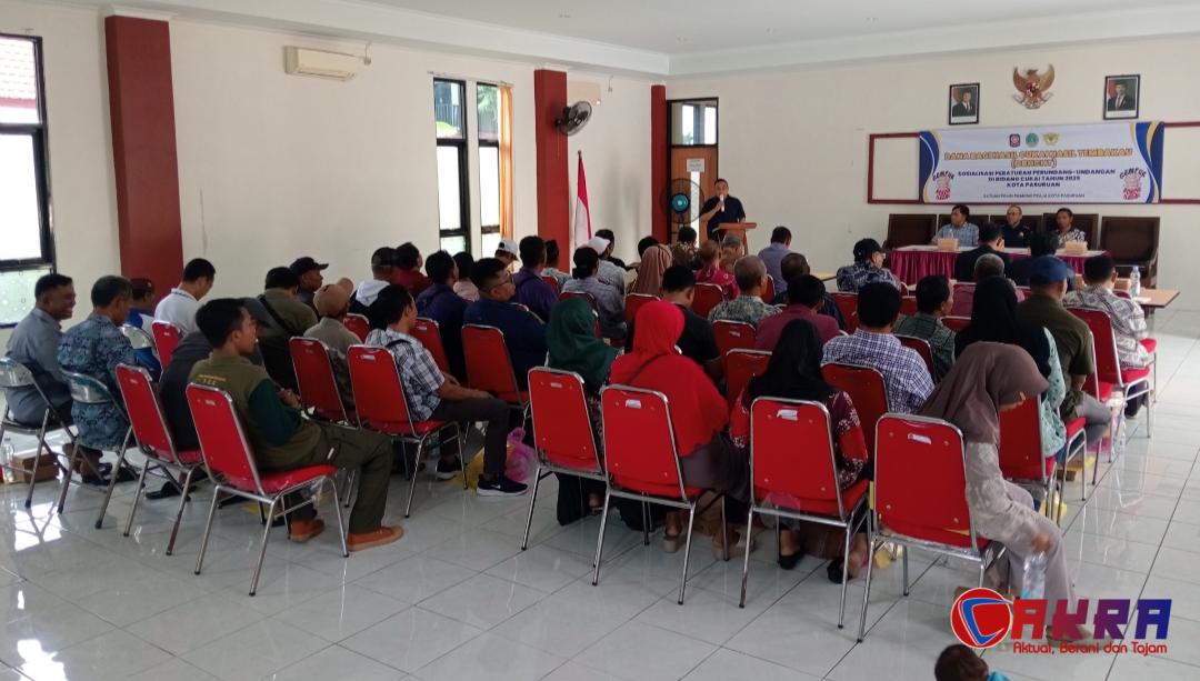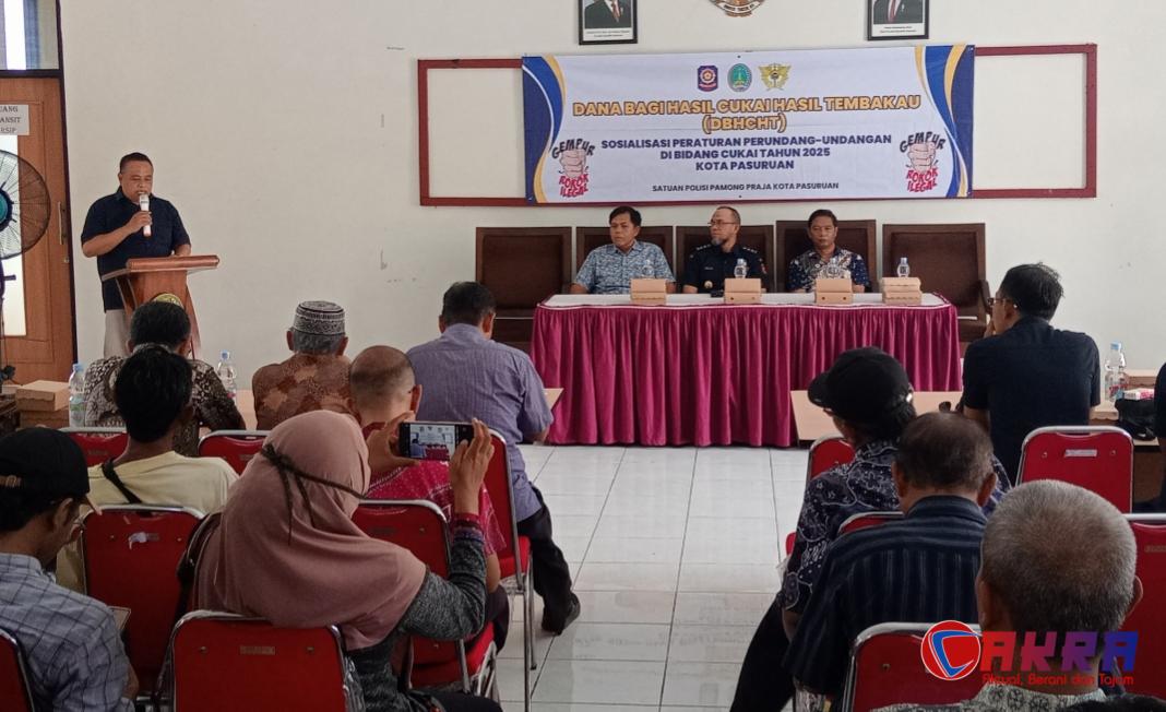 KOTA PASURUAN NewsCakra.com – Bea Cukai Kota Pasuruan melalui program Dana Bagi Hasil Cukai Hasil Tembakau (DBHCHT) menggelar sosialisasi peraturan perundang-undangan di bidang cukai tahun 2025. Acara ini berlangsung di Aula Kecamatan Bugul Kidul, Jumat (21/11/25) pagi, dihadiri sekitar 50 tamu undangan.