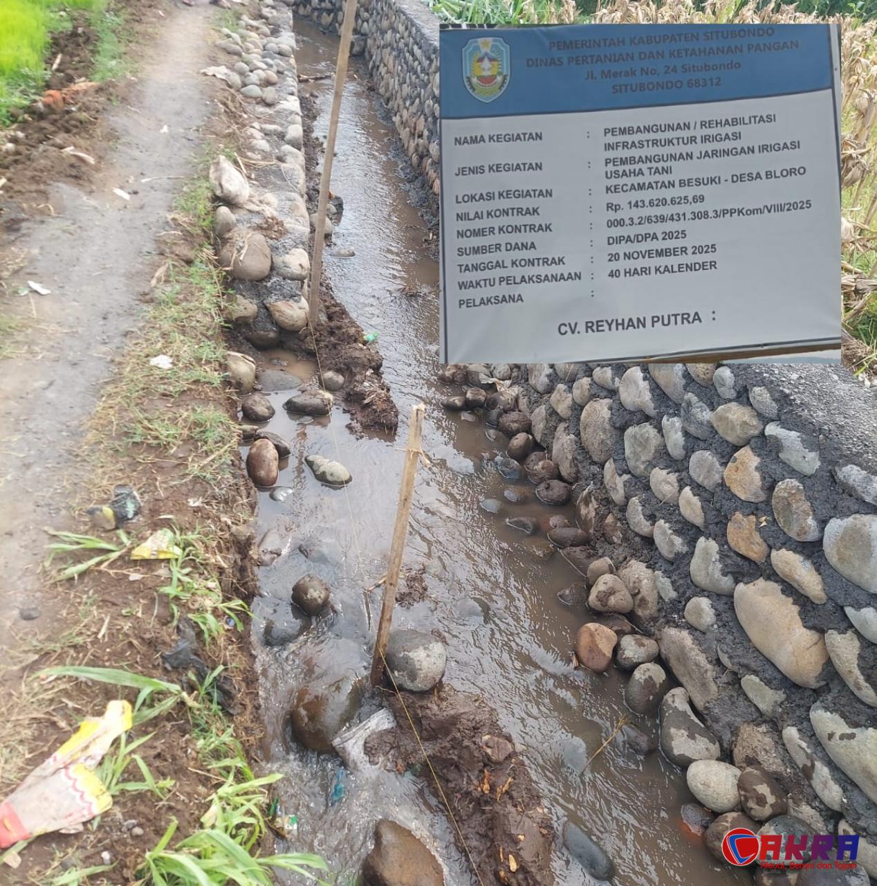 Situbondo ,Newscakra.com – Proyek pembangunan jaringan irigasi usaha tani di Desa Bloro, Kecamatan Besuki, Kabupaten Situbondo, menjadi sorotan tajam setelah investigasi tim media pada Selasa (09/12/2025) menemukan dugaan pengerjaan yang tidak sesuai spesifikasi. Proyek yang dianggarkan oleh Pemerintah Kabupaten melalui Dinas Pertanian dan Ketahanan Pangan (Dispertangan) ini diduga kuat mengabaikan mutu dan kualitas.