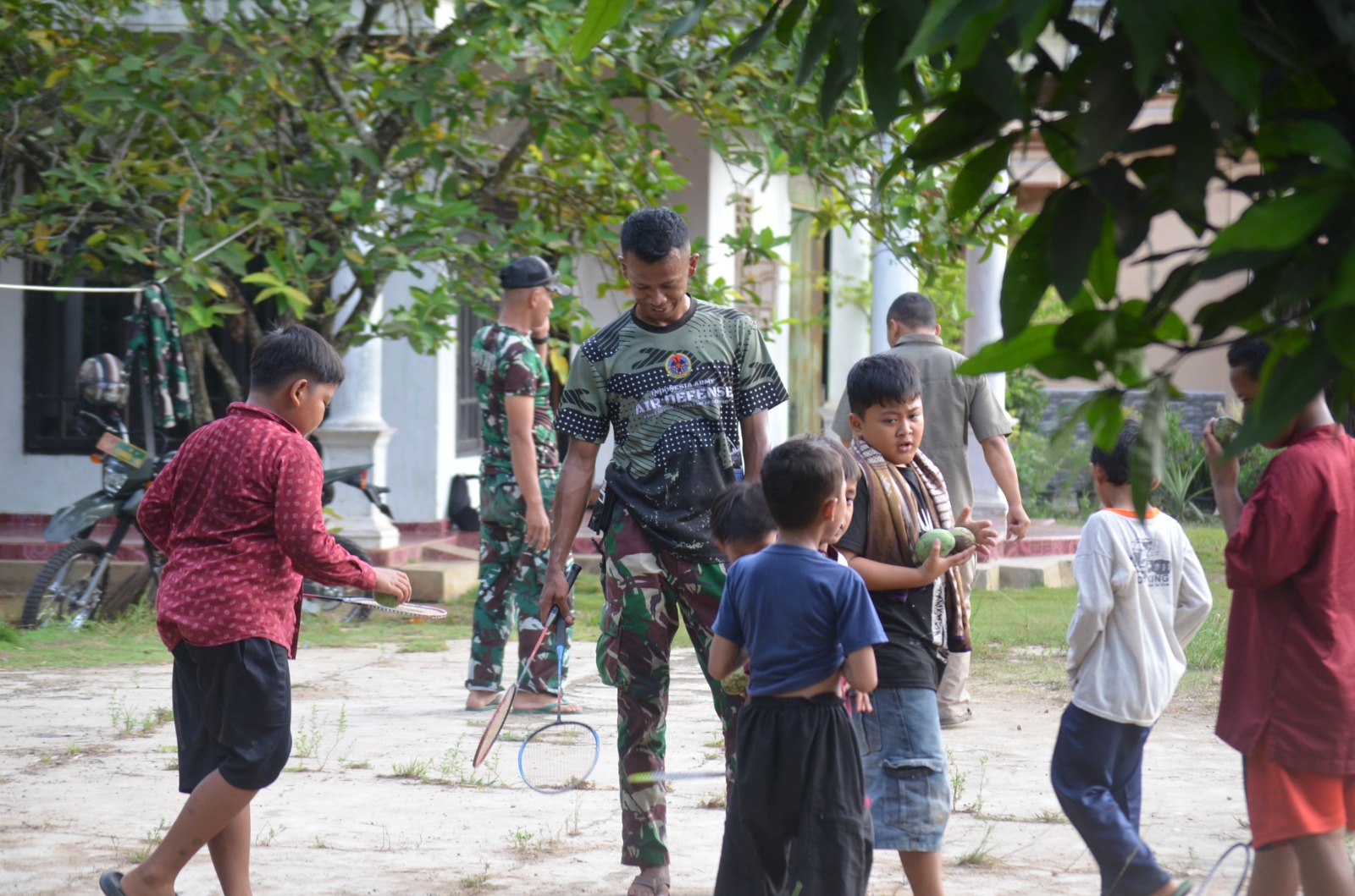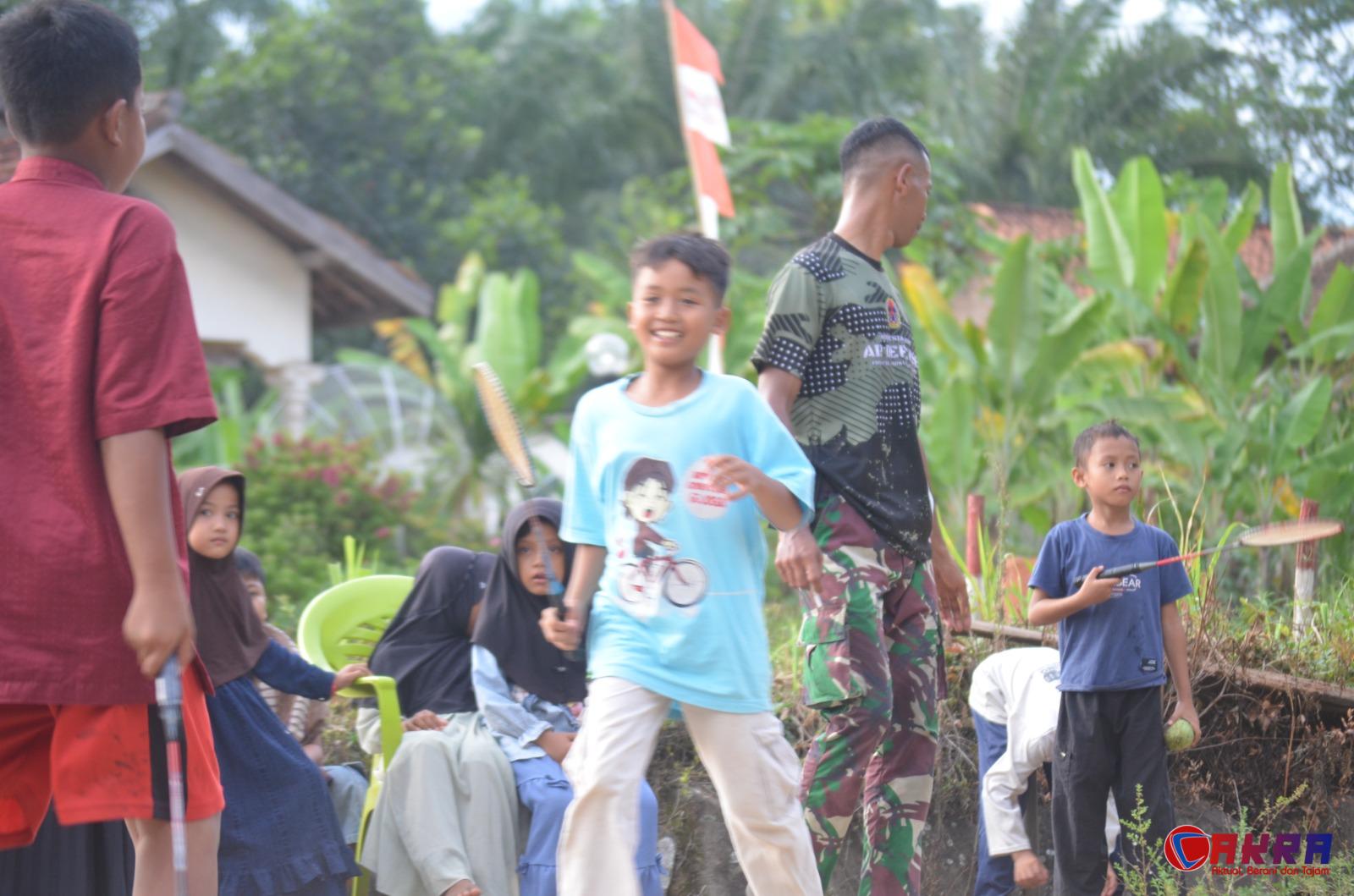 Salah satu momen yang paling berkesan adalah saat anggota Satgas TMMD bermain badminton bersama anak-anak dan warga sekitar. Tawa riang dan semangat kebersamaan memenuhi halaman rumah penduduk, menjadi bukti nyata kemanunggalan TNI dan rakyat yang terjalin erat.