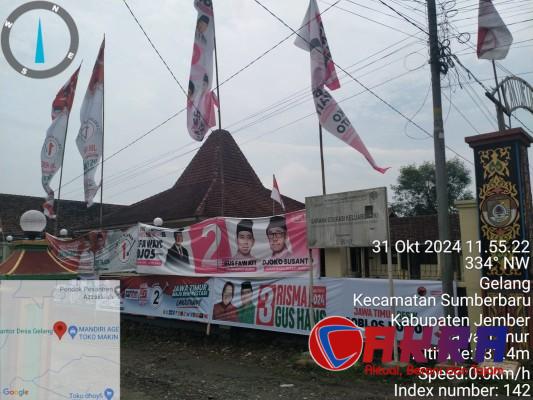 JEMBER ll www.cakra.or.id ll – Sungguh sangat disayangkan, dimana sejumlah alat peraga kampanye (APK) berupa banner dan umbul-umbul berukuran besar bergambar beberapa pasangan calon Gubernur Jawa Timur tampak terpampang hingga menutupi atau menyelimuti pagar milik Kantor Desa Gelang, Kecamatan Sumberbaru, Kabupaten Jember.