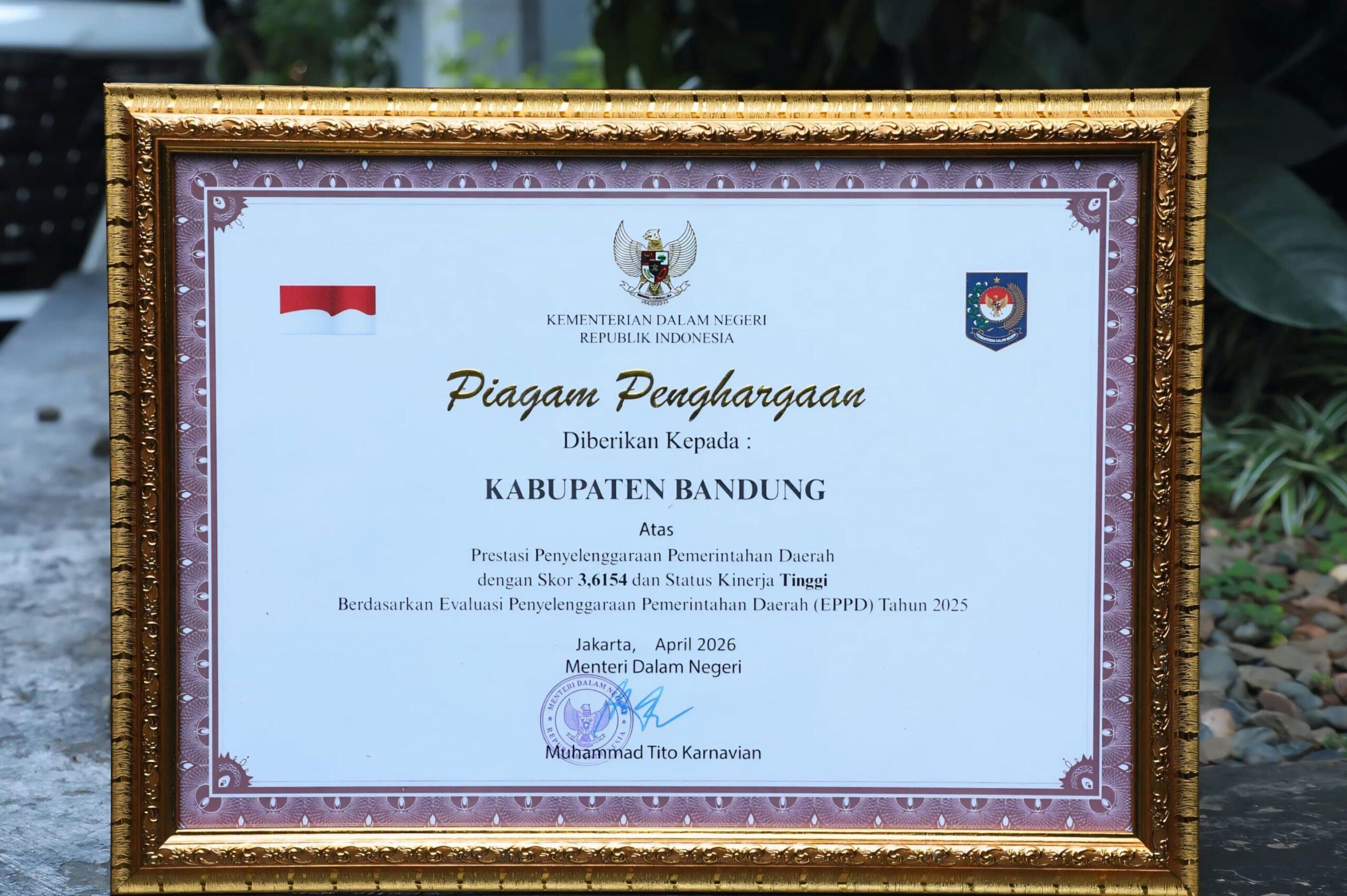 Berdasarkan hasil Evaluasi Penyelenggaraan Pemerintahan Daerah (EPPD) Tahun 2025 terhadap LPPD Tahun 2024 pada Senin (27/4/2026) yang ditetapkan melalui Keputusan Mendagri Nomor 100.2.1.7–2109 Tahun 2025, Kabupaten Bandung mencatatkan sejarah baru dengan meraih status “Kinerja Tinggi.”