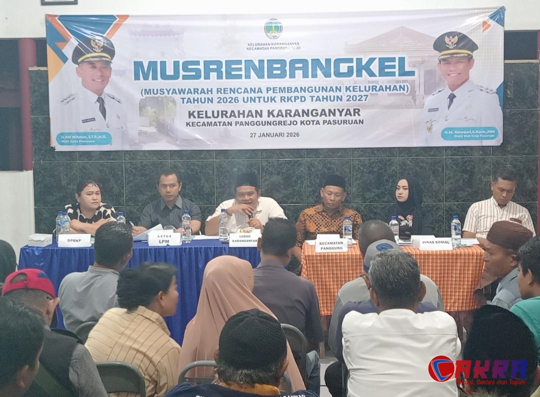 KOTA PASURUAN newscakra.com — Pemerintah Kelurahan Karanganyar, Kecamatan Panggungrejo, Kota Pasuruan, sukses menggelar Musyawarah Perencanaan Pembangunan Kelurahan (Musrenbangkel) Tahun 2026 untuk RKPD Tahun 2027. Bertempat di balai kelurahan pada Selasa (27/01/2026) malam, forum ini menjadi wadah krusial bagi warga untuk menyuarakan kebutuhan pembangunan fisik maupun peningkatan kualitas sumber daya manusia (SDM).