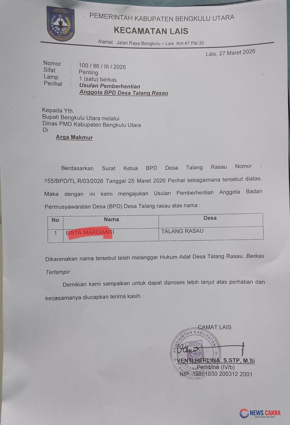 Kepala Dinas PMD Bengkulu Utara mengonfirmasi bahwa pihaknya telah menerima surat usulan pemberhentian dari Camat Lais. Usulan tersebut didukung oleh dokumen lengkap, termasuk: