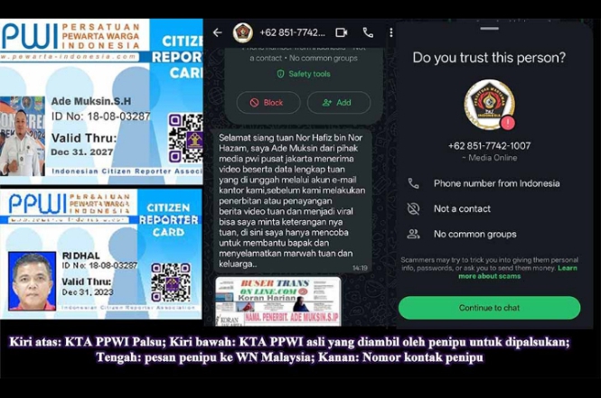 Nor Hafiz menyampaikan bahwa dirinya diminta mentransfer uang sebesar 500 Ringgit Malaysia ke rekening Bank BRI Nomor: 016001090432502, atas nama Kemas Fathir Destwo, oleh orang yang mengaku bernama Ade Muksin, S.H. Permintaan tersebut disampaikan melalui pesan WhatsApp yang mengatasnamakan staf media PWI. Dalam pesan itu, pelaku mengirimkan kartu tanda anggota (KTA) yang tampak seperti milik PWI. Namun setelah ditelusuri, kartu tersebut ternyata merupakan KTA PPWI atas nama Ridhal yang telah dimodifikasi.