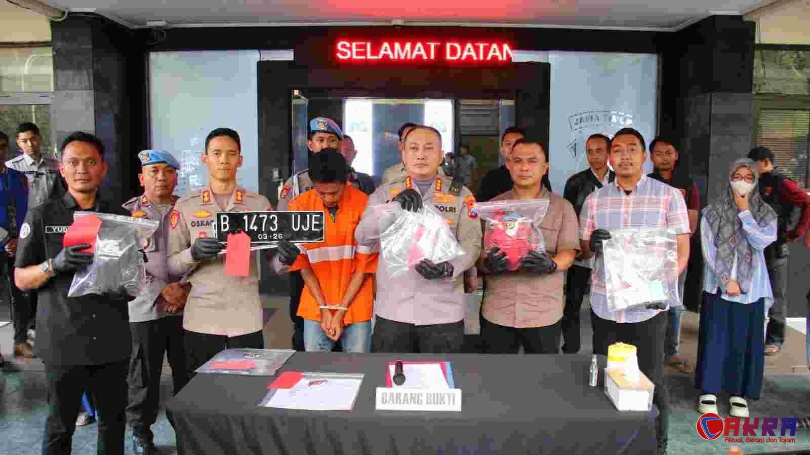 Sejumlah barang bukti turut diamankan untuk proses penyelidikan lebih lanjut, antara lain satu unit mobil Calya warna oranye dengan nomor Polisi B 1473 UJE, satu bilah pisau dapur bergagang merah, satu unit handphone merek Samsung milik pelaku, satu buah penutup wajah warna hitam, satu lembar print out bukti transfer melalui QRIS, serta satu buah jaket warna cokelat tua.