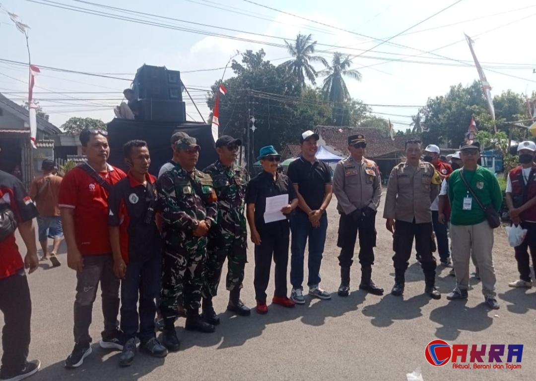 Kepala desa Kaliwining Samsul Arifin memberikan sambutan pada peserta karnaval sebelum diberangkatkan dari Star dipertigaan dusun Gayam dan finish hingga lapangan dusun curah Suko.