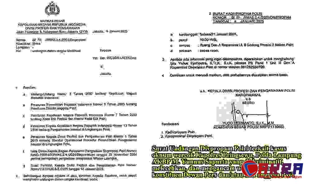 Jakarta , Cakra.or.id – Divisi Profesi dan Pengamanan (Propam) Polri telah memanggil Ketua Persatuan Pewarta Warga Indonesia (PPWI), Wilson Lalengke, untuk memberikan klarifikasi terkait laporannya mengenai dugaan pelecehan dan ancaman yang dilakukan Kapolres Pringsewu, AKBP M. Yunnus Saputra, terhadap wartawan.