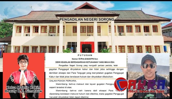 Hal itu disampaikan ketua Tim Pengacara tergugat, Advokat Simon Maurits Soren, S.H., M.H., kepada media ini, Senin, 22 September 2025. Setelah melalui proses persidangan panjang di PN Sorong, akhirnya Majelis Hakim memutuskan menerima eksepsi tergugat dan menolak dengan tegas gugatan pihak penggugat.