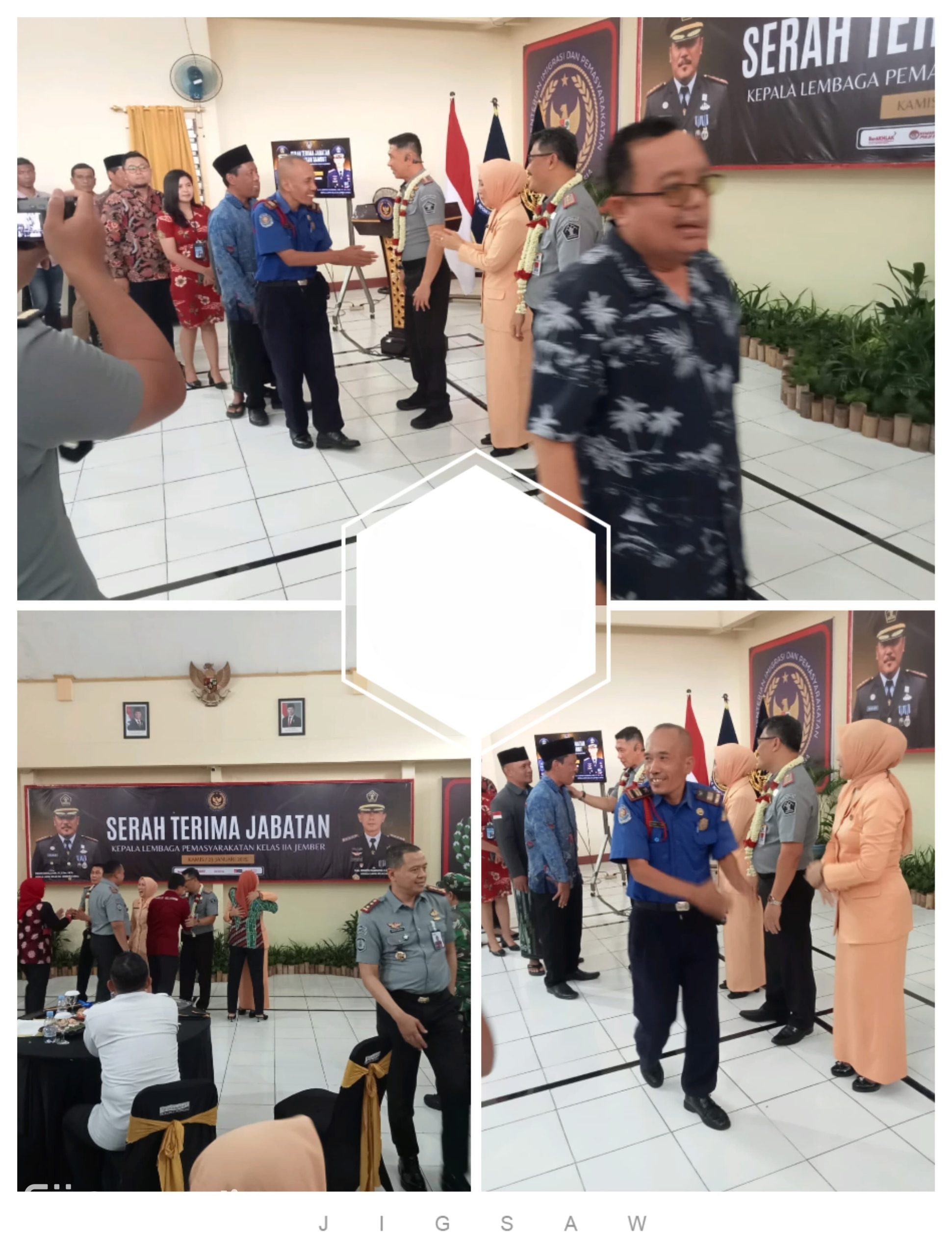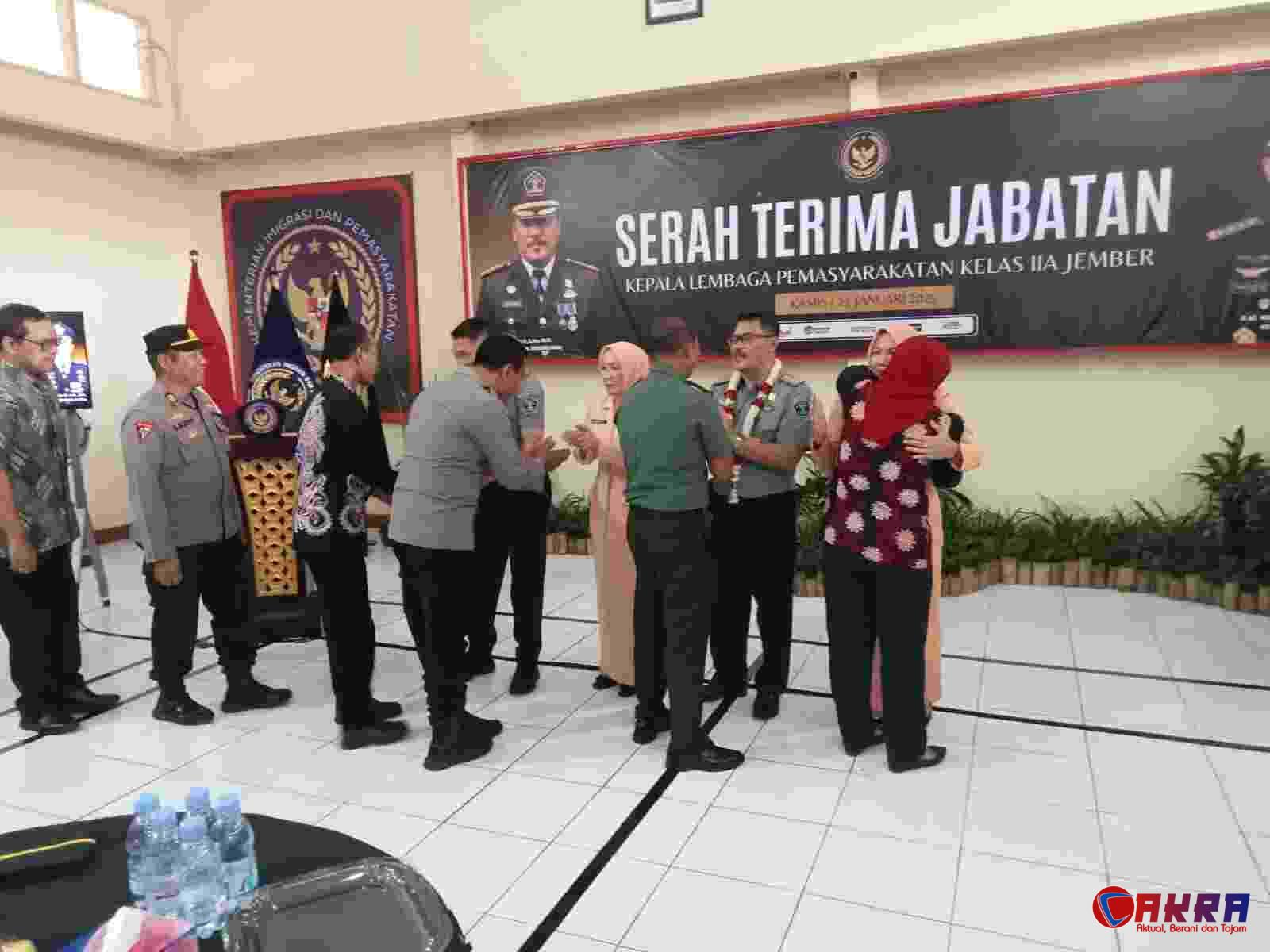 JEMBER , Cakra.or.id – Acara lepas pisah dan serah terima jabatan Kepala Lembaga Pemasyarakatan (Kalapas) Jember berlangsung khidmat pada Minggu (23/01). Hasan Basri, A.M.D.S.Sos.M.Si., yang telah menjabat sebagai Kalapas Jember, menyerahkan tongkat estafet kepemimpinan kepada R.M. Kristyo Nugroho, AMD.IP.SH.MH. Acara dihadiri oleh sejumlah pejabat, termasuk Kapolsek Patrang AKP Suparman, Danposramil, dan beberapa perwakilan Organisasi Perangkat Daerah (OPD) Jember.