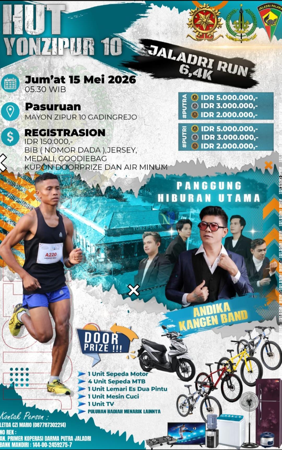 Pelaksanaan Race: Jumat, 15 Mei 2026 di Markas Yonzipur 10, Kec. Gadingrejo, Kota Pasuruan.