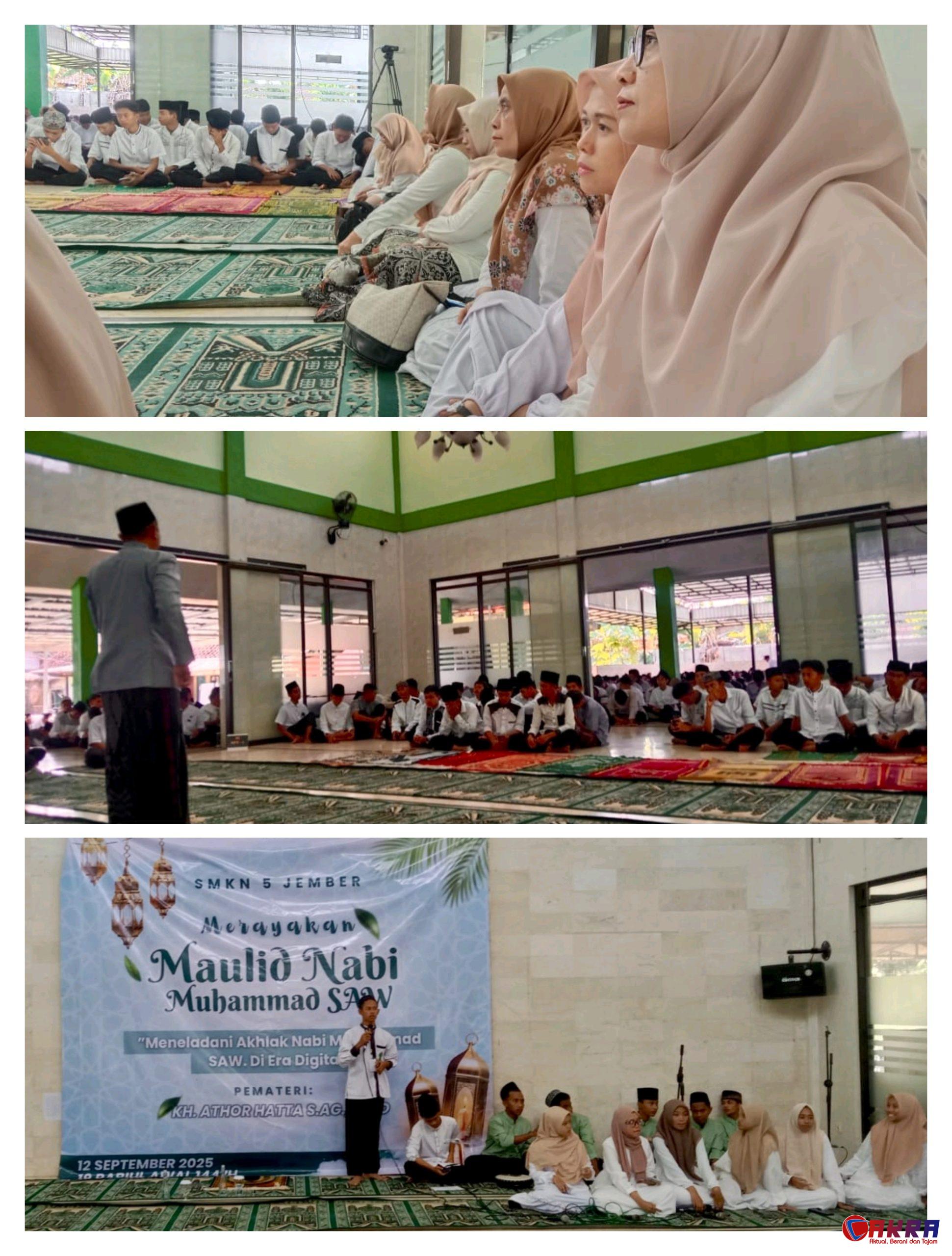 JEMBER, Cakra.or.id – Dalam rangka memperingati Maulid Nabi Muhammad SAW 1447 Hijriah, SMK Negeri 5 Jember mengadakan acara tasyakuran dan pengajian. Acara ini berlangsung di Masjid SMK Negeri 5 Jember pada Jumat, 12 September 2025.