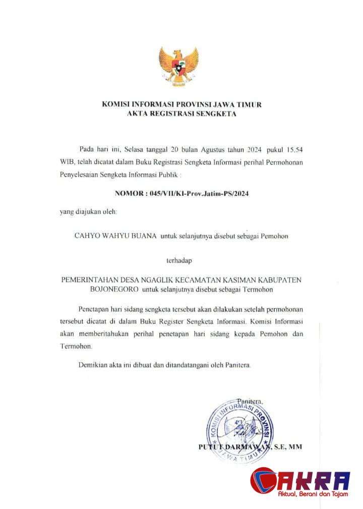 CAKRA.OR.ID | Bojonegoro – Warga Desa Sambeng, Kecamatan Kasiman, Kabupaten Bojonegoro, mengungkapkan kekecewaannya atas tidak ditanggapinya Permohonan Informasi (PI) maupun Pengajuan Keberatan (PK) ke Pejabat Pengelola Informasi dan Dokumentasi (PPID) maupun Atasan PPID Desa Ngaglik terkait beberapa informasi publik yang diminta. Menurut Wahyu, dirinya telah mengajukan permohonan informasi publik selama jangka waktu yang telah ditentukan sebagaimana UU KIP nomor 14 tahun 2008 maupun Peraturan Komisi Informasi (Perki) nomor 1 tahun 2018 tentang Standar Layanan Informasi Publil (SLIP) Desa, tetapi tetapi tidak ada tanggapan sehingga berlanjut ke Pengajuan Keberatan dan kemudian Pengajuan Penyelesaian Sengketa Informasi di KIP Jawa Timur.