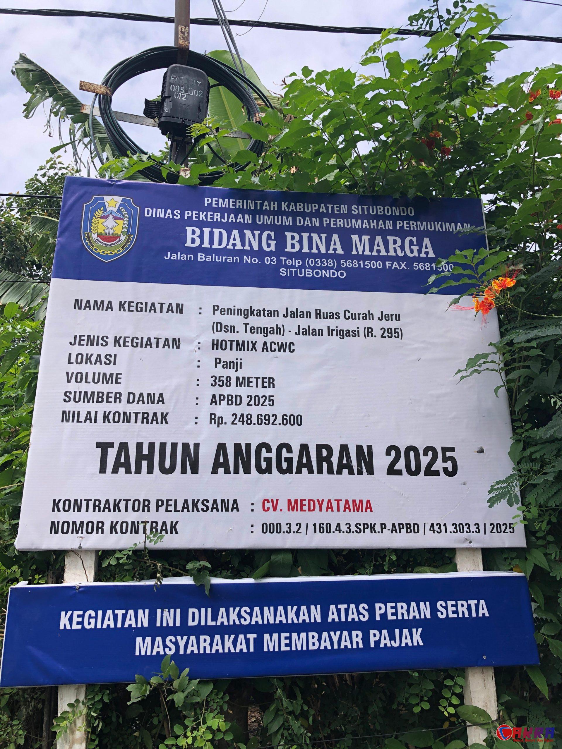 SITUBONDO NEWSCAKRA.COM – Kualitas pekerjaan hotmix pada proyek Peningkatan Jalan ruas Curah Jeru (Dsn. Tengah) – Jalan Irigasi Yang Berlokasi Di Desa Curah Jeru Kecamatan Panji Kabupaten Situbondo Jawa timur menuai kritik keras dari masyarakat. Proyek senilai Rp. 248.692.600 yang didanai oleh APBD Kabupaten Situbondo dan dikerjakan oleh CV. MEDYATAMA ini diduga kuat dikerjakan asal jadi, menimbulkan indikasi kerugian negara hingga puluhan juta rupiah.