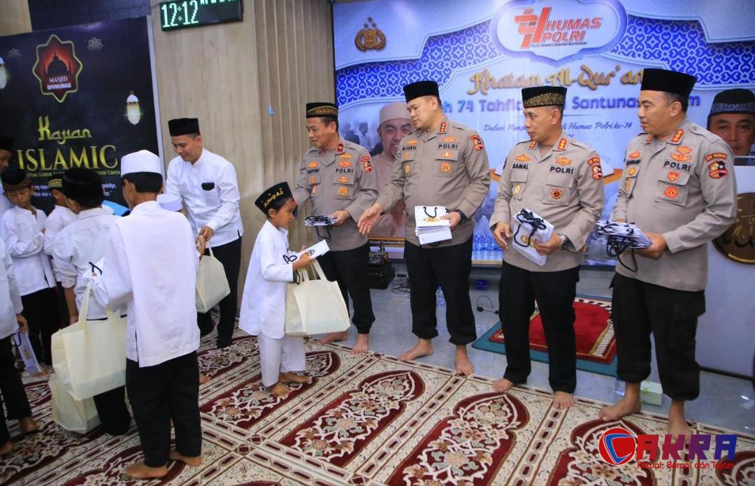 Jakarta newscakra.com – Divisi Humas Polri memberikan tali kasih kepada sejumlah anak yatim dalam rangka Hari Jadi ke-74. Kegiatan ini diselenggarakan usai khataman Al-Qur’an yang melibatkan 74 orang Tahfiz Quran dari sejumlah pesantren beserta personel anggota Divhumas Polri.