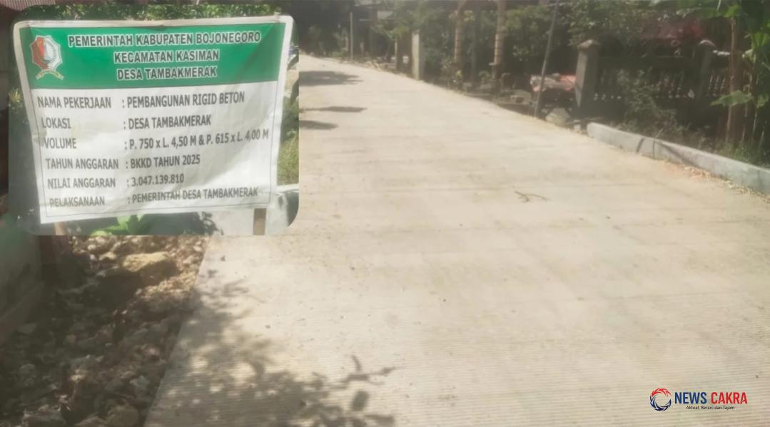 BOJONEGORO, Newscakra.com — Senyum sumringah terpancar dari wajah warga Desa Tambak Merak, Kecamatan Kasiman. Pasalnya, proyek pembangunan jalan rigid beton yang didanai dari anggaran Bantuan Keuangan Khusus Desa (BKKD) Tahun 2025 telah dinyatakan rampung seratus persen dan kini siap menunjang roda perekonomian desa.